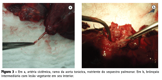 O raciocínio clínico diante desses achados foi de bronquiectasia consequente à obstrução brônquica crônica. A paciente foi submetida a toracotomia posterolateral direita com bilobectomia (lobo médio e inferior). Durante o período intraoperatório, após a secção do ligamento pulmonar, iniciou-se um processo hemorrágico originado de um vaso arterial anômalo que irrigava o parênquima do SP (Figura 3). A hemostasia foi alcançada após a ligadura do vaso. O exame histopatológico foi compatível com o achado de SP. No pós-operatório, houve evolução satisfatória, sem complicações, e a paciente obteve alta no quinto dia pós-operatório.