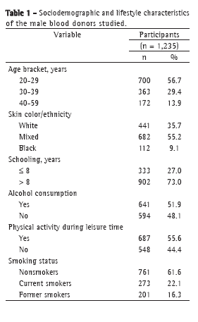 MethodsThe present study was based on a previous analysis of a cross-sectional study involving blood donors and conducted between August of 1999 and January of 2000. The study sample comprised 1,235 adult male blood donors aged 20-59 years and recruited from the Cuiabá Blood Bank, located in the city of Cuiabá, Brazil. Details on the sampling process for that study have been published elsewhere.(13)