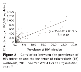 The increase in the rates of tuberculosis/HIV co-infection poses challenges that prevent the reduction in the incidence of both infections, and these challenges have been well documented in recent years. The increase in the overall prevalence of HIV has serious implications for tuberculosis control programs, particularly in countries in which the prevalence of tuberculosis is high. In addition to contributing to an increase in the number of tuberculosis cases, HIV has been a major factor responsible for increased mortality among co-infected patients.(6)