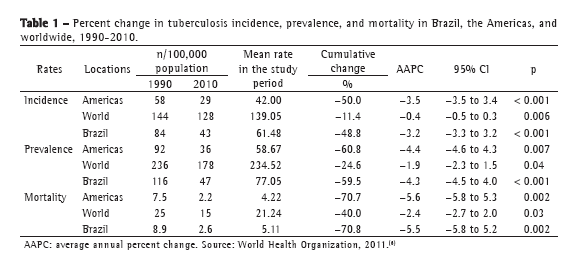 The results shown in Table 1 reveal that there was a significant decrease in the prevalence of tuberculosis in Brazil, the Americas, and worldwide; however, the estimated incidence of the disease per 100,000 population decreased noticeably in Brazil and the Americas but not worldwide.(14)