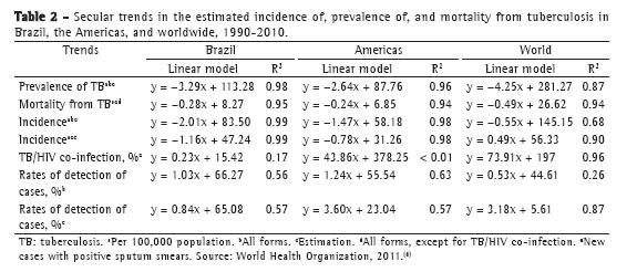 Table 2 shows the secular trends in the estimated incidence and prevalence of tuberculosis, as well as in the estimated mortality from tuberculosis, in Brazil, the Americas, and worldwide in the 1990-2010 period. The trend toward a decrease in the overall prevalence of tuberculosis was more pronounced in the world population than in the Brazilian population, as well as being more pronounced in the Brazilian population than in the population of the Americas; the trend toward a decrease in the estimated mortality from tuberculosis (all forms of tuberculosis, except for tuberculosis/HIV co-infection) per 100,000 population was more pronounced in the world population than in the Brazilian population, as well as being more pronounced in the Brazilian population than in the population of the Americas; the trend toward a decrease in the estimated incidence of tuberculosis (all forms) per 100,000 population was more pronounced in Brazil and the Americas, the estimated incidence of all forms of tuberculosis having slightly increased worldwide; the estimated incidence (new cases with positive sputum smears) per 100,000 population decreased in Brazil and the Americas, having increased worldwide; the upward trend in tuberculosis/HIV co-infection was more pronounced in the world population than in the population of the Americas, as well as being more pronounced in the Americas than in Brazil; the trend toward an increase in the rates of detection of new cases (all forms) was more pronounced in the Americas than in Brazil, as well as being more pronounced in Brazil than in the world; finally, the trend toward an increase in the rates of detection of new cases (with positive sputum smears) was more pronounced in the Americas than in the world, as well as being more pronounced in the world than in Brazil.