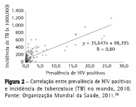 Desde a década de 1980, o HIV tem sido um dos principais fatores que contribuíram para o ressurgimento da tuberculose tanto nos países desenvolvidos quanto nos em desenvolvimento.(7,8) Esse vírus alterou o equilíbrio entre os seres humanos e o bacilo de Koch, assim como teve um impacto evidente na epidemiologia, na história natural e na evolução clínica da tuberculose.(9,10) A coinfecção tuberculose/HIV resulta em taxas de mortalidade mais altas do que a infecção somente pelo HIV.(5-8) A resistência aos tuberculostáticos e o risco aumentado de transmissão também surgiram como problemas em razão do abandono do tratamento da tuberculose.(7) Demonstrou-se que os pacientes infectados pelo HIV têm maior risco de reativação da infecção tuberculosa latente, em razão da resposta imunológica deficiente, e que a AIDS é um forte fator de risco para óbito em pacientes com tuberculose. Em pacientes coinfectados, a mortalidade comumente se relaciona ao diagnóstico tardio, uma vez que alguns indivíduos infectados pelo HIV adiam a procura por serviços de saúde para evitar receber um diagnóstico de AIDS.(11)