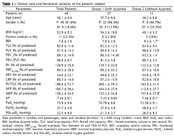 In clinical practice, obesity is rarely recognized as cause of dyspnea, and the mechanisms involved in its genesis are not well known. In addition, it remains unclear how altered respiratory function corre-lates with the intensity of the sensation of dyspnea in these individuals. In view of this, the objective of this study was to investigate the occurrence of dyspnea in patients with pronounced obesity and without accompanying diseases or a significant smoking habit. An additional aim was to compare individuals complaining of dyspnea to those without such complaints in terms of the respiratory function data. Finally, we attempted to determine whether the intensity of dyspnea correlates with respiratory function parameters and with BMI.