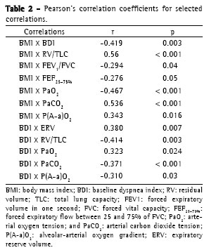 In conclusion, dyspnea has proven to be a quite common symptom in individuals with class II or III obesity. Although the mechanisms related to the occurrence of dyspnea are complex and are not completely understood, the findings of the present study suggest that obstruction of the small airways and worsening of gas exchange plays a role in the genesis of the symptom in such patients. Additional studies, focused on the investigation of the genesis of dyspnea in individuals with class II or III obesity, will, of necessity, have to evaluate these aspects.