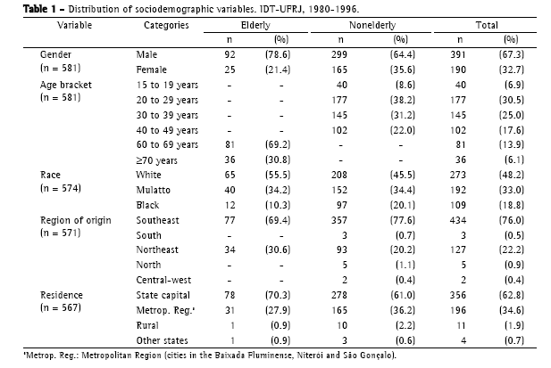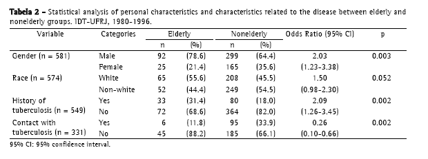The following exclusion criteria were defined in order to ensure homogeneity of the sample studied: change of diagnosis; initial suspicion of nontuberculous mycobacteriosis or multidrug resistance; HIV co-infection; and age bracket from 50 to 59 years. We opted for the exclusion of this age bracket, since the highest incidence of the disease in the Brazilian population is in the age brackets up to 49 years.(20). In addition, this exclusion allows a clear distinction to be drawn between elderly and nonelderly, with a 10-year gap between the two groups. All of the information was collected from clinical charts, according to reports of the clinical and surgical teams of the hospital, in addition to reports from the Departments of Bacteriology, Radiology and Pathological Anatomy. The following variables were studied: gender (male, female); age (years); race (white, mulatto, black or unknown); state of origin; residence (cities classified as state capital, metropolitan region, rural or out-of-state); history of pulmonary TB; contact with pulmonary TB; respiratory symptoms (cough, expectoration, dyspnea, hemoptysis and chest pain); constitutional symptoms (fever, adynamia, sweats, appetite loss and weight loss), time since symptom onset (in days, from symptom onset until diagnosis), direct microscopy (Ziehl-Neelsen technique) of available specimens (sputum, bronchial lavage, bronchoalveolar lavage, pleural biopsy and pleural fluid); culture medium for mycobacteria (Löwenstein- Jensen medium); histopathological examination (hematoxylin and eosin staining); tuberculin test (reaction to the Mantoux test or to purified protein derivative RT-23); and radiological aspects of chest X-ray in anteroposterior and lateral incidences, including infiltrates, cavities and lung mass, as well as pleural alterations such as effusion, pleurisy and pneumothorax. The chi-square test or Fisher's test was used to compare categorical variables between the groups, and numeric variables were compared using Mann-Whitney test (time since symptom onset). Odds ratios and the respective 95% confidence intervals were used in order to compare the elderly and nonelderly groups in terms of exposure. The level of significance adopted was 5% (p < 0.05). The statistical analysis was made using SAS System software. The study was approved by the local ethics committee, in accordance with the guidelines put forth in Brazilian National Health Council Resolution nº. 196/96.