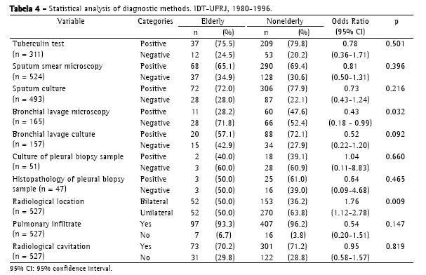 in the nonelderly group. Similarly, sputum culture presented high positivity in the sample as a whole (>72%), without statistical significance. The tuberculin test also showed similar reactivity between the groups (>75%), and the most frequently found chest X-ray alterations were infiltrates (>90%) and cavitations (>70%). Chest X-ray, however, did not reveal predominance of any of these findings in the groups studied (Table 4). Nevertheless, the extent of the disease, as evaluated by quantifying unilateral and bilateral damage, presented a statistically significant difference, with 50% of the elderly patients presenting bilateral damage, compared with 36% of the nonelderly patients (p = 0.009). Pleural histopathology, which is rarely used in this population of patients, presented satisfactory performance in both groups, with 50% positivity in the elderly patients and 61% in the nonelderly patients.