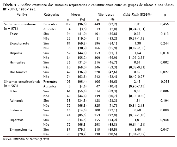 O tempo sintomático da TP foi aferido em 566 pacientes e variou de 0 a 720 dias. O tempo mediano de 90 dias para os idosos e 60 dias para os não idosos demonstrou bem a significância entre os grupos (p = 0,0001). Houve, no entanto, casos extremos de idosos com tempo sintomático superior a 1 ano. Os sintomas respiratórios foram estudados em 578 pacientes e estiveram presentes em 561. Cento e doze (96,5%) eram idosos e 449 (97,2%) não idosos. A Tabela 3 revelou a freqüência e discriminação destes sintomas entre os grupos. Nesta análise, a tosse foi o sintoma igualmente mais comum em toda a amostra (acima de 80%) e ficou evidente a associação significativa da dispnéia com os idosos e da hemoptise e dor torácica com os não idosos. A dispnéia foi relatada em 52 (44,8%) idosos e 153 (33,1%) não idosos (p = 0,018); a hemoptise em 216 (46,7%) não idosos e 36 (31%) idosos (p = 0,002) e a dor torácica em 220 (47,6%) não idosos e 42 (36,2%) idosos (p = 0,027).