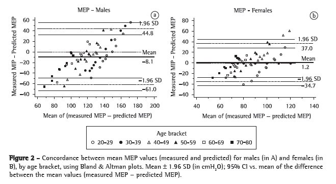 DiscussionThe search for reference values for respiratory muscle strength has encouraged researchers in several countries to establish equations. Johan et al.(11) compared MIP and MEP values in Chinese, Malaysian and Indian adults and found significant ethnic differences in the respiratory pressures. Bruschi et al.(12) established equations for the Italian population, considering age and gender, as well as body surface area.