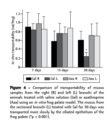 In the animals that received azathioprine, we found that it reduced MCT velocity in the group killed after 7 days of treatment both on the right (intact) side and on the left (operated) side. Over time, there is evident recovery of MCT velocity on the right and left sides, indicating that MCT velocity is affected by azathioprine only in initial period of up to 7 days of treatment. This mechanism might result from the fact that azathioprine decreases cell activity and reaches the ciliated cells, altering their function. The recovery of ciliated cell function, over time, in the group that received azathioprine is probably due to two factors that lead to increased MCT velocity: bronchial scarring and improved mucus formation/properties. Many immunosuppressive protocols include azathi oprine as a pre-operatively administered drug.(19) Based on the results of the present study, we suggest that azathioprine administration, as well as the duration of azathioprine treatment in the post-transplant period, be the object of several other experimental studies.