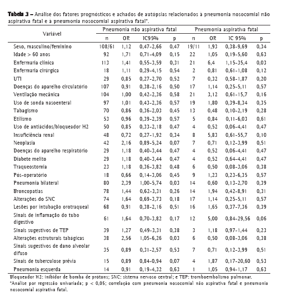 Nossos resultados não mostraram associações entre os desfechos PNnA fatal ou PNA fatal com outros fatores de risco classicamente conhecidos para a ocorrência da PN, tais como doenças cardiovasculares e respiratórias; uso prévio de antibioticoterapia; uso de antiácidos e de bloqueadores de bomba de prótons; uso de sonda nasogástrica, cânula traqueal ou realização de traqueostomia; ventilação mecânica; doenças neurológicas; gravidade da doença de base; e cirurgias prévias, principalmente torácicas ou abdominais altas.(22)