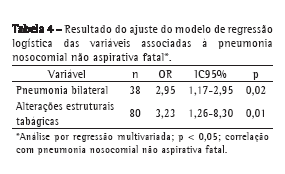 A Tabela 4 apresenta os resultados das variáveis após a análise multivariada para testar o grau de associação com o desfecho PNnA fatal.