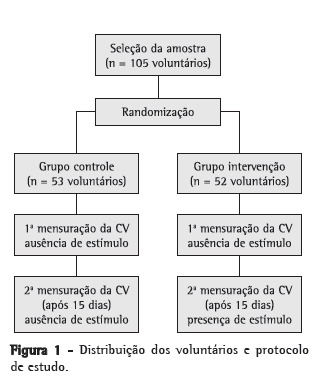 Os voluntários foram alocados aleatoriamente em dois grupos: Grupo Controle (GC) e Grupo Intervenção (GI). A randomização foi realizada através da tabela de números randômicos. A CV foi mensurada nos dois grupos; entretanto, para o GI, foi adicionado o reforço positivo (Figura 1).