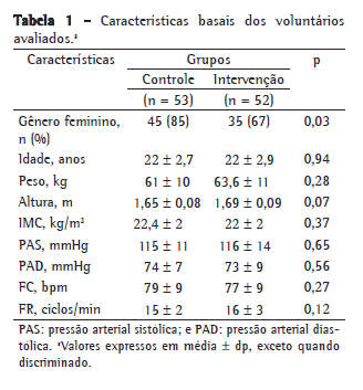 Foram avaliados 105 voluntários. Desses, 53 voluntários foram randomizados para o GC e 52 para o GI. As características basais dos voluntários estão apresentadas na Tabela 1.