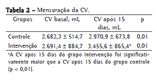 Quando comparada a CV1 entre os grupos (Tabela 2), não foi evidenciada diferença significante quanto à condição pulmonar basal (p = 0,31). Ao compararmos CV1 e CV2 intragrupos, foi observado um aumento da CV2 em ambos os grupos (p = 0,01). Quando comparada a CV2 entre os grupos, observou-se que, no GI, a CV2 foi maior do que no GC, sendo essa diferença significante (p = 0,01).