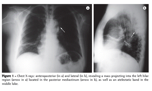 The clinical manifestations of Castleman's disease range from asymptomatic forms or forms with mild localized lymphadenopathy to recurrent forms of generalized lymphadenopathy with severe systemic symptoms.(9) In the localized form of the disease, there is lymphadenopathy, usually located in the mediastinum or abdomen, although the disease can also manifest as a pulmonary nodule or a nodule in the pelvis, axilla, or neck.(10,11) Symptoms can result from compression by the lesion, or Castleman's disease can be an incidental finding in imaging studies in asymptomatic patients.(7,9) In this patient, Castleman's disease manifested as a single mass in the posterior mediastinum, without systemic symptoms.