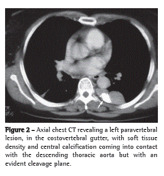 A chest X-ray revealed a mass in the region of the posterior mediastinum, which was confirmed by a preoperative chest CT scan, which identified a heterogeneous mass with dense calcification in the region of the left costovertebral gutter (Figures 1 and 2). The mass in the posterior mediastinum was resected together with the adjacent lung parenchyma. The histopathological examination revealed a lymph node whose architecture was partially distorted by spindle cell proliferation in close association with an inflammatory infiltrate, composed predominantly by lymphocytes. We identified characteristics that were definitely consistent with hyaline vascular-type Castleman's disease: follicles showing slight germinal center regression; a concentric arrangement of small lymphocytes; and collagenous stroma. The proliferating spindle cells formed spiral fascicles and matrices, with cells with ill-defined borders, vesicular nuclei, and distinct nucleoli, with little variation in nucleus size, as well as varying degrees of atypia, morphologically consistent with follicular dendritic cell sarcoma. Immunohistochemical analysis was negative for the following markers: 40-, 48-, 50-, and 50.6-kDa cytokeratins; CD30; CD246; CD21; CD23; CD4RB; CD68; smooth muscle actin; and