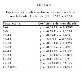 O coeficiente de mortalidade geral em Fortaleza, no período avaliado, foi em média de 5,7 óbitos/1.000 habitantes (desvio-padrão de 0,8), variando de 7,7 óbitos/1.000 habitantes em 1980 a 4,7 óbitos/1.000 habitantes em 1992. Em relação a 2001, o coeficiente de mortalidade geral em Fortaleza encontrou-se estável desde 1982 (p > 0,05), tendo sido maior apenas em 1980 e 1981 (p < 0,05) (Tabela 1). A tendência do coeficiente de mortalidade geral padronizado foi decrescente no período (y = -0,1191x + 7,7158).