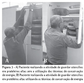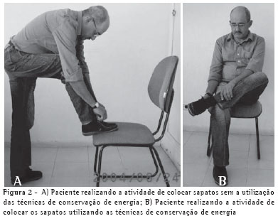 Segundo alguns autores,(22) no que concerne à conservação de energia e treino das AVD, os objetivos são: treinar a respiração diafragmática, primeiro em repouso para que o paciente tenha percepção dos movimentos respiratórios durante a inspiração e expiração e, depois, durante a realização das tarefas, evitando que o paciente faça breves períodos de apnéia; treinar os membros superiores, visando ao aumento da tolerância ao trabalho; programar atividades com níveis distintos de exigência, iniciando com atividades leves, lentas e com menor gasto energético, por exemplo treinar primeiramente atividades de higiene pessoal em posição sentada e com apoio dos membros superiores (escovar dentes, pentear cabelos, fazer a barba, lavar o rosto, maquiar-se) e, depois, sentada sem apoio de membros superiores (depilar axilas e tomar banho); simplificar o desenvolvimento de algumas tarefas, adaptando o ambiente, como elevação do vaso sanitário, colocação de barras de apoio e corrimão no banheiro, ou fazendo uso de tecnologia assistiva, como calçadeira de cabo longo, pente com cabo longo, andadores com assento e cesta de bagagem, entre outros; eliminar atividades desnecessárias, como enxugar louças (uso de escorredor), secar-se após o banho (uso de roupão felpudo) ou amarrar sapatos (preferir calçados sem cadarços); orientar quanto à importância em solicitar auxílio de familiares, cuidadores ou outros, quando necessário; organizar o tempo, planejando o dia e a semana, considerando os tempos gastos na realização das atividades e o tempo necessário para descanso, incentivando o uso de agendas; organizar o ambiente de modo que os materiais a serem utilizados pelo paciente permaneçam em locais de fácil acesso, ou seja, entre as cinturas escapular e pélvica, evitando a necessidade de grandes amplitudes de movimento de membros superiores sem sustentação, além da flexão de tronco; orientar quanto às posturas mais adequadas na realização de cada uma das tarefas, adaptando a forma de realizar as atividades, ou seja, quando o paciente tiver que utilizar os braços deve fazê-lo com apoio em uma mesa, bancada ou mesmo no lavatório do banheiro, além de evitar a flexão do tronco.