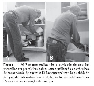 O ensinamento para se cruzar uma perna sobre a outra evita que o paciente faça flexão de tronco durante o ato de colocar e retirar os sapatos (Figura 2). Organizando-se o ambiente e os objetos de uso freqüente, evitam-se grandes amplitudes de movimento para guardar seus utensílios em lugares muito altos (Figura 3) ou muito baixos (Figura 4).