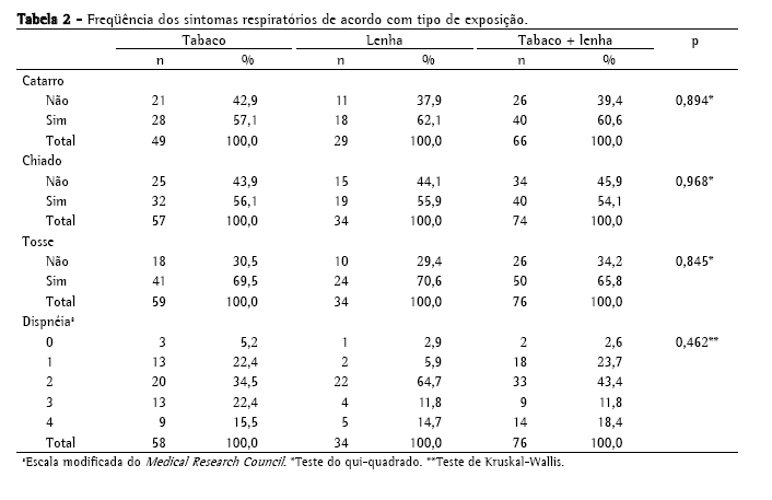Quando analisados quanto a sintomas de tosse, chiado e presença de catarro, não foi observada diferença estatisticamente significante entre os grupos (os valores quanto aos sintomas foram, respectivamente, p = 0,845; p = 0,968; e p = 0,894). Houve maior freqüência de dispnéia moderada (grau 2) em todos os grupos (p = 0,141). Não houve diferença significante na freqüência do sintoma dispnéia, independente do grau, entre os grupos (Tabela 2). Em alguns questionários, faltavam respostas a alguns itens; por isso, as amostras diferem do número total em alguns desses itens.