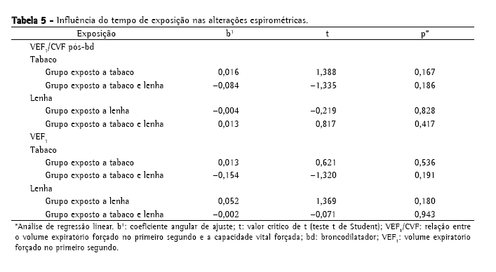 Não se observou correlação entre o grau de exposição e os valores da relação VEF1/CVF e VEF1 pós-broncodilatador em nenhum dos três grupos (p > 0,05; Tabela 5).