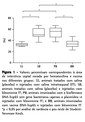 Recentemente um biofármaco baseado na tecnologia do DNA recombinante, que utiliza como antígeno a 65-kDa heat shock protein (hsp65; proteína de choque térmico de 65 kDa do Mycobacterium leprae), foi desenvolvido em nosso meio e vem mostrando resultados promissores tanto na prevenção como no tratamento da tuberculose em roedores.(11-15) Os estudos mostraram que animais infectados com o bacilo da tuberculose, quando expostos a este antígeno, foram capazes de alterar sua resposta imunológica inicial promovendo a expressão de citocinas do tipo Th1, com conseqüente aumento de IFN-γ e diminuição de unidades formadoras de colônias bacterianas. Em função desses achados, levantamos a hipótese de que a imunização de animais com o biofármaco DNA-hsp65 pudesse promover proteção contra alterações inflamatórias e fibrosantes induzidas pela injeção de bleomicina intratraqueal (IT) em camundongos.