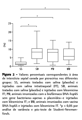 Objetivo: Avaliar a influência do biofármaco DNA-hsp65 em um modelo de distúrbio fibrosante pulmonar experimental. Métodos: Foram estudados 120 camundongos machos C57BL/6, divididos em quatro grupos: grupo SS, animais tratados com salina (placebo) e injetados com salina intratraqueal (IT); grupo SB, tratados com salina (placebo) e injetados com bleomicina IT; grupo PB, tratados com plasmídeo, sem gene bacteriano, e injetados com bleomicina IT; e grupo BB, tratados com DNA-hsp65 e injetados com bleomicina IT. A bleomicina foi injetada 15 dias após a última imunização, e os animais sacrificados seis semanas após o uso da droga IT. O pulmão esquerdo retirado foi utilizado para análise morfológica, e o pulmão direito para dosagens de hidroxiprolina. Resultados: A proporção de camundongos que apresentaram morte não-programada depois de 48 h da injeção IT foi maior no grupo SB em comparação ao grupo SS (57,7% vs. 11,1%). A área percentual média de interstício septal foi maior nos grupos SB e PB (53,1 ± 8,6% e 53,6 ± 9,3%, respectivamente) em comparação aos grupos SS e BB (32,9 ± 2,7% e 34,3 ± 6,1%, respectivamente). Os grupos SB, PB e BB mostraram aumentos nos valores médios da área de interstício septal corada por picrosirius em comparação ao grupo SS (SS: 2,0 ± 1,4%; SB: 8,2 ± 4,9%; PB: 7,2 ± 4,2%; e BB: 6,6 ± 4,1%). O conteúdo pulmonar de hidroxiprolina no grupo SS foi inferior ao dos demais grupos (SS: 104,9 ± 20,9 pg/pulmão; SB: 160,4 ± 47,8 pg/pulmão; PB: 170,0 ± 72,0 pg/pulmão; e BB: 162,5 ± 39,7 pg/pulmão). Conclusões: A imunização com o biofármaco DNA-hsp65 interferiu na deposição de matriz não-colágena em um modelo de lesão pulmonar induzida por bleomicina.