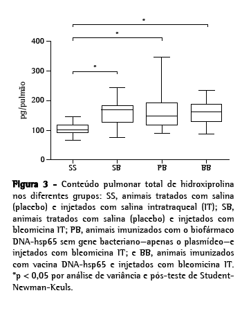 A técnica de coloração pelo picrosirius cora especificamente fibras colágenas. Do mesmo modo, os valores teciduais do aminoácido hidroxiprolina refletem o grau de deposição de colágeno nos órgãos. No presente estudo, o reconhecimento densitométrico digital das fibras colágenas identificadas pelo primeiro método não mostrou diferenças significantes entre os valores médios dos grupos SB, PB e BB. O conteúdo pulmonar de hidroxiprolina mostrou comportamento semelhante às colorações pelo picrosirius sugerindo igualmente que o biofármaco DNA-hsp65, no presente modelo, não interferiu no grau de deposição do colágeno induzida pela bleomicina.