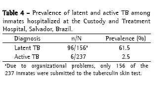 The objective of the present study was to determine the prevalence of latent and active TB among inmates in a prison hospital (Hospital de Custódia e Tratamento - HCT, Custody and Treatment Hospital) in Bahia, a state located in the northeast of Brazil.