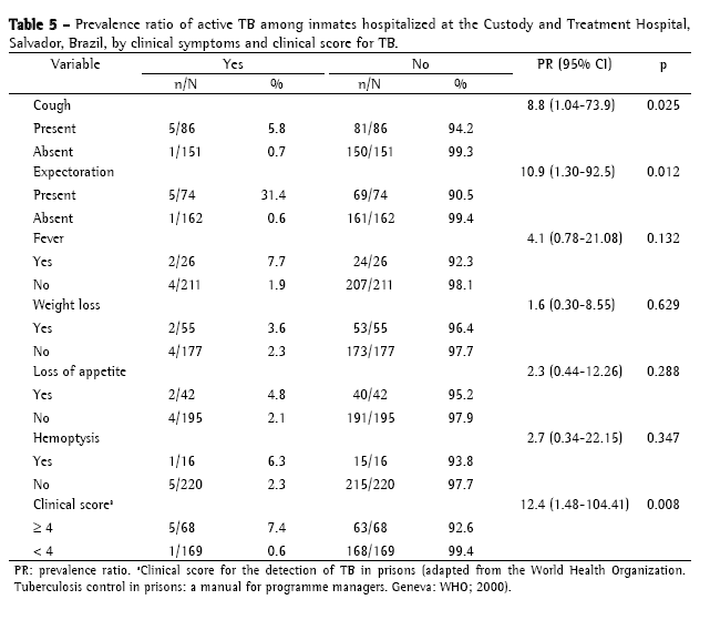 Two clinical symptoms were identified as predictors of active TB in the present study: cough and expectoration. The comparison of the prevalence of active TB in the groups with and without cough revealed a prevalence ratio (PR) of 8.8 (95% CI: 1.04-73.92; p = 0.025). Regarding expectoration, the PR of the two groups was 10.9 (95% CI: 1.30-92.0; p = 0.012). There were no statistically significant associations between the other clinical symptoms evaluated and active TB (Table 5): fever (PR = 4.1; 95% CI: 0.78‑21.08; p = 0.132); weight loss (PR = 1.6; 95% CI: 0.30‑8.55; p = 0.629); loss of appetite (PR = 2.3; 95% CI: 0.44‑12.26; p = 0.288); and hemoptysis (PR = 2.7; 95% CI: 0.34‑22.15; p = 0.347). Regarding the clinical scoring system suggested by the WHO for the detection of TB in prisons,(17) we used a maximum score of six, since the variable "chest pain" was not available in our database. Therefore, a cut-off point equal to or greater than four was used to define the probability of symptoms detecting the cases. The comparison of the two groups of inmates revealed a statistically significant association between scores equal to or greater than four and active TB (PR = 12.4; 95% CI: 1.48-104.41; p = 0.008).