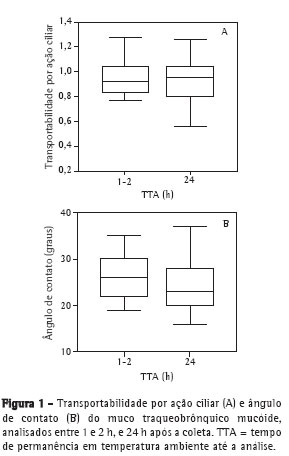 Em conclusão, o muco traqueobrônquico mucóide pode ser mantido em temperatura ambiente por 24 h, sem que ocorra alteração na sua transportabilidade por ação ciliar ou no seu ângulo de contato. O muco traqueobrônquico purulento, no entanto, não deve permanecer em temperatura ambiente por muitas horas, pois sofre alterações em suas propriedades físicas, podendo tornar-se liquefeito. Entretanto, como não foram realizadas análises intermediárias entre 2 e 24 h após a coleta, futuros estudos precisam ser feitos para se determinar qual o tempo máximo em que o muco purulento pode permanecer em temperatura ambiente, para se evitar alterações em sua estrutura e, conseqüentemente, em sua transportabilidade.