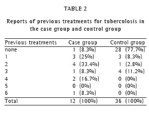 The mean number of previous tuberculosis treatments was 0.9, varying from 0 to 6, and this number was greater in the case group than in the control group. Only one patient in the case group had not been submitted to previous treatment. In the control group, 77% of the individuals had not had previous treatment for tuberculosis. In another study, it was reported that 85.4% of the patients with multidrug-resistant tuberculosis had had two or more previous tuberculosis treatments, similar to the 91.6% found in the present study.(18-19) The mean number of previous tuberculosis treatments was 2.3 in the case group and 0.47 in the control group. These data are similar to those reported for Brazil as a whole, in which patients with multidrug-resistant tuberculosis had received an average of 2.8 previous tuberculosis treatments.(4)