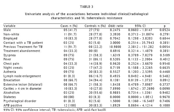 The results indicate that the only statistically significant association was between M. tuberculosis resistance and the variable 'previous treatment for tuberculosis' (p = 0.0374). In this study, individuals with history of tuberculosis had a fourteen-time greater chance of developing resistance than did individuals with no history of tuberculosis.
