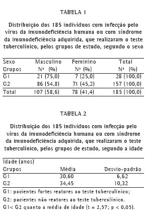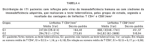 Objective: To evaluate tuberculin test results and relate them to the presence or absence of active tuberculosis, as well as to CD4+ and CD8+ T-lymphocyte counts. Method: The charts of 802 patients with acquired immunodeficiency syndrome treated between August of 1985 and March of 2003 were reviewed. Of the 185 patients submitted to tuberculin tests (23.1%), 107 (57.8%) were male, and 78 (42.2%) were female. Patients were divided into two study groups: tuberculin test reactors (n = 28); and tuberculin test non-reactors (n = 157). Among the reactors, the mean age was 30.60 years, with a standard deviation of 6.62 years, compared with 34.45 years, with a standard deviation of 10.32 years, among the non-reactors. Results: Most of the individuals tested presented only a mild response to the tuberculin test. We found that, at the time of the test, the percentage of individuals with active tuberculosis was greater in the reactor group than in the non-reactor group. During the test period, 10 reactor group patients and 11 non-reactor group patients presented some clinical form of active tuberculosis. In addition, CD4+ T-lymphocyte counts were lower than 200 cells/mm3 in 6 reactor group patients and in 8 non-reactor group patients. Conclusion: Indurations greater than 5 mm were unrelated to higher absolute CD4+ T-cell counts.