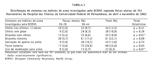 Analisando-se a freqüência do relato dos sintomas relacionados à asma segundo o avançar da idade, detectou-se que, proporcionalmente, as faixas etárias não diferiram quanto à presença de sibilos nos últimos doze meses, sibilos com gripe, sensação de aperto no peito e tosse noturna, pois obedeceram à proporção amostral de 1:4 entre adultos jovens (20 a 29 anos) e adultos (30 a 44 anos). No entanto, os sintomas de dispnéia com sibilos e uso de medicação foram mais freqüentes entre os indivíduos com idade entre 20 e 29 anos, na proporção aproximada de 1:1 entre adultos jovens e adultos (Tabela 2).
