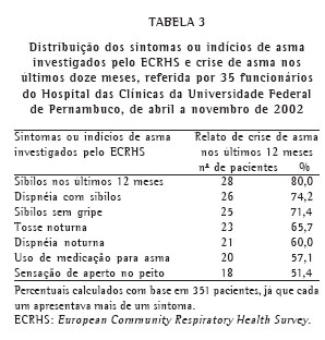 Ordenando-se os sintomas ou indícios investigados no ECRHS, significativamente associados com crise de asma nos últimos doze meses, segundo a freqüência, observaram-se: sibilos nos últimos doze meses, dispnéia com sibilos, sibilos sem gripe, tosse noturna, dispnéia noturna, uso de medicação para asma e sensação de aperto no peito (Tabela 3).