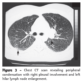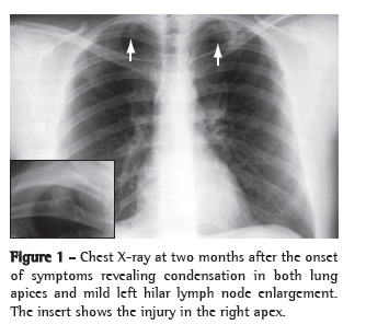 A 28-year-old white male, who was a physician and a resident of the city of Ribeirão Preto, Brazil, presented with a three-month history of daily fever (37.5-38.5°C). He also presented with intense nonproductive cough, chest pain in the right subscapular region, loss of appetite and malaise. The patient received a nonsteroidal anti-inflammatory drug for 10 days, and the symptoms were attenuated. With the discontinuation of the drug, the fever returned, together with headache, malaise and productive cough with yellow expectoration. The patient received amoxicillin/clavulanate, and the expectoration decreased. However, he had dry cough, loss of appetite, prostration, weakness, night sweats and irregular fever, all of which had intensified within the last few days. In addition, he had lost approximately 4 kg of body weight.