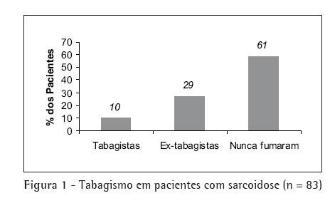 O tabagismo foi um achado infreqüente (10%), o que pode contribuir para o diagnóstico precoce, pois diminui o fator de confusão dos sintomas respiratórios associados. Embora alguns autores tenham concluído que fumar protege contra a sarcoidose, ainda não se obteve evidência que suporte esta afirmação.(35)