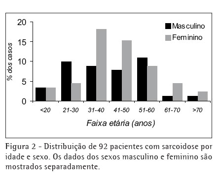 Inicialmente, deve-se analisar alguns dados de um estudo anterior da casuística do Pavilhão Pereira Filho, que incluiu 138 casos de sarcoidose diagnosticados entre 1965 e 1989, com as seguintes características: idade - média de 30,7 anos, 21 casos abaixo de 20 anos (15%), 91 casos entre 20 e 40 anos (66%), e 26 casos acima de 40 anos (19%); sexo - feminino em 79 casos (57%) e masculino em 59 casos (43%); cor - branca em 106 casos (77%) e negra em 32 casos (23%).(29)