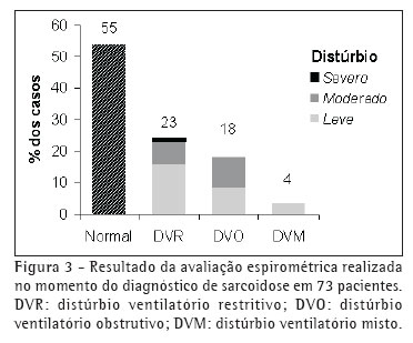 Os resultados da espirometria indicam que a sarcoidose geralmente não tem grande impacto funcional pulmonar, uma vez que mais da metade dos pacientes teve o exame normal, e quando alterado, geralmente a disfunção foi de pequena intensidade. O padrão do distúrbio ventilatório pode ser tanto obstrutivo quanto restritivo, dependendo da distribuição das lesões (parênquima pulmonar versus vias aéreas) e da presença de co-morbidades.