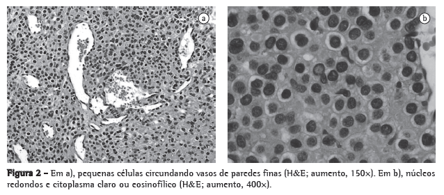 Relato de casoPaciente do sexo masculino com 32 anos de idade relatou febre e tosse seca 9 meses antes da internação. Naquela ocasião, recebeu tratamento para pneumonia em outro local, mas a tosse seca continuou. O exame físico revelou sibilância do lado direito, e a radiografia mostrou atelectasia de lobo superior direito (Figura 1a). A TC de tórax revelou uma lesão endobrônquica ocluindo o brônquio do lobo superior direito (Figura 1b), sem adenomegalia mediastinal. A fibrobroncoscopia revelou um tumor endobrônquico localizado no brônquio do lobo superior direito. O tumor tinha uma superfície avermelhada lisa e havia obstruído o brônquio do lobo superior direito, sem protrusão para o brônquio principal direito. A biópsia forneceu resultados inconclusivos. O paciente foi submetido à toracotomia direita com um diagnóstico provável de tumor carcinoide. Como o lobo superior direito era atelectásico e fibrótico, procedeu-se a uma lobectomia superior direita. O exame histológico intraoperatório demonstrou margens brônquicas exíguas, e, portanto, foi realizada uma broncoplastia em cunha. Não foi realizada dissecção radical dos linfonodos mediastinais. O paciente teve uma recuperação sem intercorrências e recebeu alta hospitalar no quarto dia pós-operatório. O exame patológico da peça ressecada revelou um tumor polipoide no brônquio do lobo superior direito, medindo 1,7 × 1,0 cm. O exame microscópico revelou um tumor formado por vasos com paredes finas circundado por pequenas células com núcleos redondos e citoplasma claro ou eosinofílico (Figuras 2a e 2b). As margens ressecadas estavam livres de tumor. A análise imuno-histoquímica mostrou que as células eram positivas para actina de músculo liso (1A4) e neuron-specific enolase (NSE, enolase neuroespecífica). Os testes para citoqueratina (AE1/AE3 e CAM 5.2), cromogranina, thyroid transcription factor-1 (TTF-1; fator de transcrição tireoidiano 1) e proteína S100 foram negativos. O diagnóstico final foi de tumor glômico endobrônquico. Não houve recidiva durante os 14 meses de acompanhamento.