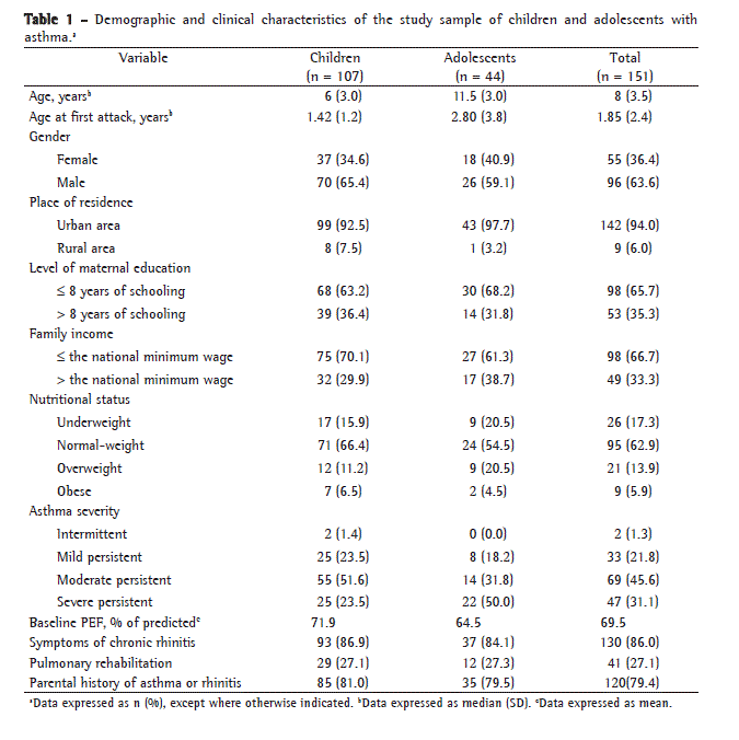 We studied 151 asthma patients, of whom 107 (70.9%) were children with a median age of 6 years and 44 (29.1%) were adolescents with a median age of 11 years. Although there was a preponderance of boys (n = 70, 65.4%; p < 0.001) among the children, no such difference was found among the adolescents. The majority of the children (92.5%) and adolescents (97.7%) resided in the urban area of the city of Feira de Santana, Brazil. In most cases, the level of maternal education was ≤ 8 years of schooling (65.7%; p < 0.001) and the family income was ≤ the national minimum wage (66.7%; p < 0.001; Table 1).