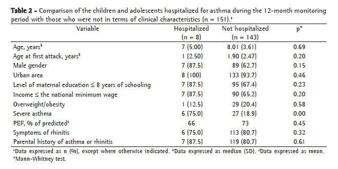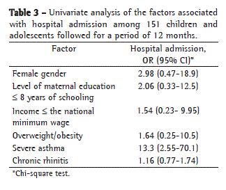 The risk factors for hospital admission among children who are not enrolled in specific programs for asthma care have been as follows: inappropriate treatment; lack of appropriate monitoring during the treatment period; low socioeconomic status; age under 5 years; and recent exacerbations.(6-9) We found no studies addressing the clinical characteristics and the predictors of hospital admission among children using anti-inflammatory medication for the treatment of asthma and under regular monitoring at a referral outpatient clinic. The characterization of these children, as well as the identification of predictors of emergency room visits and hospital admission during monitoring, can contribute to better disease control, reducing the risk of hospital admission for asthma during the treatment period and the consequent use of health resources.(10,11)