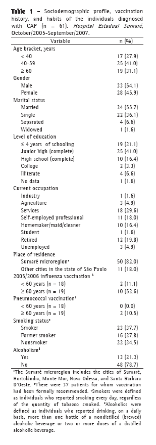Objetivo: Analisar aspectos clínicos, etiológicos e epidemiológicos das pneumonias adquiridas na comunidade (PAC) em indivíduos internados. Métodos: Foram estudados prospectivamente 66 pacientes com PAC maiores de 14 anos no Hospital Estadual Sumaré, localizado na cidade de Sumaré (SP), entre outubro de 2005 e setembro de 2007. Coletamos dados sobre história clínica, exame clínico, escore pneumonia severity index (PSI) e exames laboratoriais (hemocultura, bacterioscopia/cultura de escarro, sorologias para Chlamydophila pneumoniae, Mycoplasma pneumoniae e Legionella pneumophila, além de antígenos urinários de Legionella sp. e Streptococcus pneumoniae). Resultados: A idade média dos pacientes foi de 53 anos, a maioria tinha baixa escolaridade, e 55,7% apresentavam pelo menos uma comorbidade no momento da internação. O percentual de idosos vacinados contra influenza entre os internados foi significativamente menor que os da comunidade dos municípios da microrregião de Sumaré (52,6% vs. > 70%). A febre foi menos frequente entre os idosos (p < 0,05). A evolução clínica se associou com o escore PSI, mas não com a idade. A etiologia foi confirmada em 31 (50,8%) dos casos, sendo 21 (34,4%) devido a S. pneumoniae, detectado principalmente pelo antígeno urinário; seguido de C. pneumoniae, em 5 (8,2%). Receberam alta hospitalar por cura 80,3% dos pacientes. A taxa de letalidade foi de 4,9%. Conclusões: O conhecimento do perfil etiológico de PAC no âmbito regional favorece a escolha adequada da terapia empírica, que é particularmente relevante em pacientes idosos e naqueles com comorbidades. A falta da vacinação contra influenza em idosos é um fator de risco de internação por PAC.