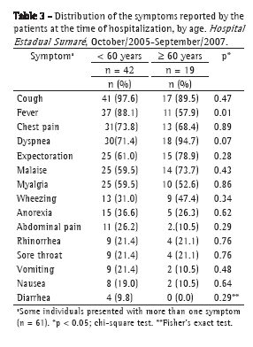 The prevalence of chronic diseases (55.7%) was often the reason for hospitalization among the patients evaluated in the present study, this prevalence being higher (94.1%) among the patients ≥ 60 years of age. Some authors have drawn attention to the occurrence of complications and clinical decompensation of chronic diseases in the presence of pulmonary infection, leading to greater severity of illness.(1-3)