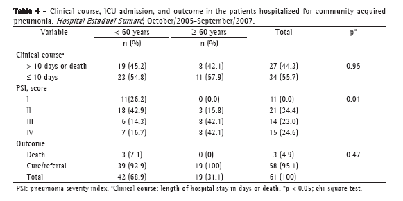 The mortality rate of the CAP inpatients was 4.9%. However, by less than 10 days after admission, 27 patients (44.3%) were free of clinical complications. Although 84.2% of the patients ≥ 60 years of age had a PSI of III or IV, whereas 69.1% of the patients < 60 years of age had a PSI of I or II, there were no deaths in the former group and the mortality rate was 7.1% in the latter (Table 4). The PSI was found to be dissociated from disease course among the patients < 60 years of age. All 5 individuals who required ICU admission were < 60 years of age, suggesting more severe profiles. We found that 32 individuals (34.4%) were in categories I or II, that is, theoretically, they could be treated as outpatients.