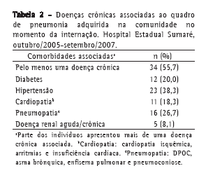 A prevalência de doenças crônicas entre os pacientes (55,7%), mais comum entre os idosos (94,1%), muitas vezes justificou a internação. Alguns autores chamam a atenção para a ocorrência de complicações e descompensações clínicas de doenças crônicas na vigência da infecção pulmonar, levando a uma maior gravidade dos casos.(1-3)