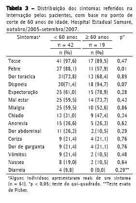 A Tabela 3 mostra os principais sintomas relacionados com o quadro de infecção pulmonar entre idosos e menores de 60 anos. A febre foi significativamente menos prevalente entre os idosos do que no grupo etário mais jovem (57,9% vs. 88,1%; p < 0,05). A presença de sintomas gastrointestinais ocorreu em aproximadamente 15% dos casos, particularmente em menores de 60 anos, dificultando o diagnóstico de pneumonia na admissão. Sintomas gripais como febre, coriza e dor de garganta foram comuns e antecedentes ao quadro infeccioso pulmonar (21,4%).