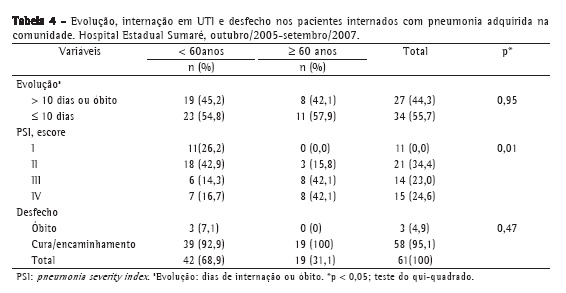 A letalidade dos casos de PAC internados foi de 4,9%, e 27 pacientes (44,3%) evoluíram sem complicações clínicas, com menos de 10 dias de internação. A maioria dos idosos (84,2%) apresentou escores III e IV do PSI, enquanto os mais jovens apresentaram escores I e II mais frequentemente (69,1%), embora a letalidade tenha sido maior nesse grupo (7,1%; Tabela 4). Observou-se uma dissociação entre os escores do PSI e a evolução dos casos entre os mais jovens. Os 5 indivíduos (100%) que necessitaram internação na UTI eram menores de 60 anos, sugerindo quadros de maior gravidade. Constatou-se que 32 indivíduos (34,4%) estavam na categoria I e II, ou seja, eles teoricamente poderiam ser tratados de forma ambulatorial.
