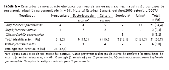 A investigação etiológica foi realizada por meio de bacterioscopia, cultura de escarro e de líquido pleural e duas amostras de sangue foram encaminhadas para hemocultura antes da administração de antibióticos. A maioria dos pesquisadores concorda que mais de três hemoculturas de rotina em 24 h não produzem um aumento significativo de resultados positivos.(3) Foram realizadas sorologias (ELISA) para C. pneumoniae, M. pneumoniae e L. pneumophila. Os resultados foram considerados positivos pelos seguintes parâmetros: para C. pneumoniae, quando o título encontrava-se triplicado na segunda amostra ou IgG ≥ 0,512 UA/mL no primeiro título; para M. pneumoniae, IgG > 40 UA/mL ou IgM positivo; e para L. pneumophila, com o primeiro título > 1:256 ou título quadruplicado na convalescência.(5) Também foram realizadas pesquisas de antígeno urinário para S. pneumoniae e L. pneumophila.
